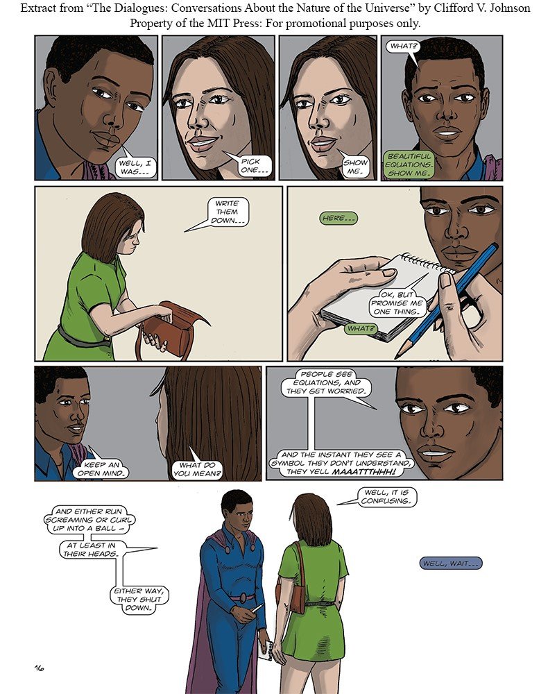 Physicist Clifford Johnson thinks that we should have more conversations about science. Science should be on our daily conversation menu, along with topics like politics, books, sports, or the latest prestige cable drama. Conversations about science, he tells us, shouldn't be left to the experts. In The Dialogues, Johnson invites us to eavesdrop on a series of nine conversations, in graphic-novel form?written and drawn by Johnson?about "the nature of the universe." The conversations take place all over the world, in museums, on trains, in restaurants, in what may or may not be Freud's favorite coffeehouse. The conversationalists are men, women, children, experts, and amateur science buffs. The topics of their conversations range from the science of cooking to the multiverse and string theory. The graphic form is especially suited for physics; one drawing can show what it would take many words to explain.