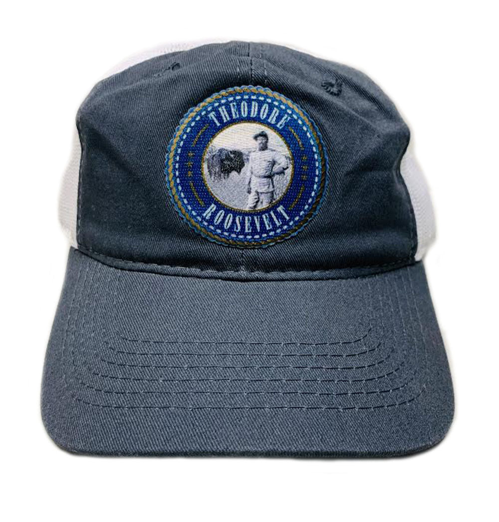 Theodore Roosevelt mesh back cap. Dark gray and white mesh with adjustable velcro strap. One size fits most. Curved bill. Patch features Roosevelt and a buffalo. In 1869, a group of New Yorkers met in the home of Theodore Roosevelt, Sr. to found the Museum. His son, the future president, was just ten years old and would one day become a pioneering conservationist and lifelong contributor to the Museum. Roosevelt was a teenager when he made his first donation to the Museum consisting of 1 bat, 12 mice, 1 turtle, 4 bird eggs, and the skull of a red squirrel.