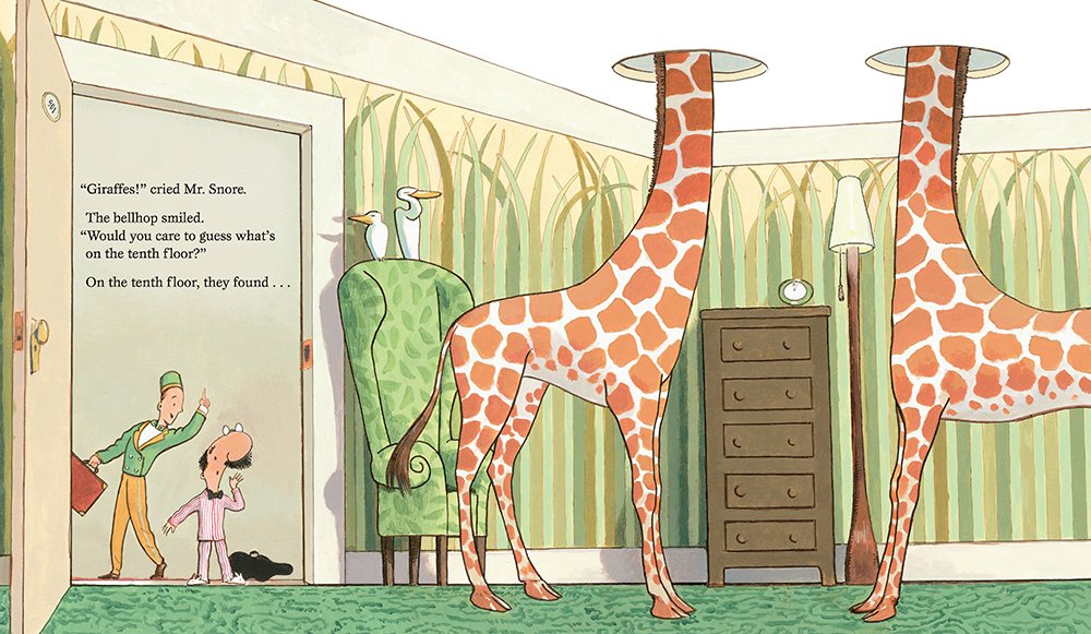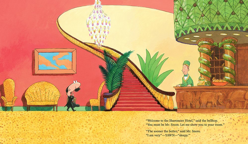 Will Mr. Snore ever get some shut-eye at the busy Sharemore Hotel? The room on the first floor is too noisy. The room on the second floor is too crowded. The room on the third floor is too damp. Everywhere Mr. Snore goes, with a dutiful bellhop leading the way, he encounters something that €™s bound to keep him awake.