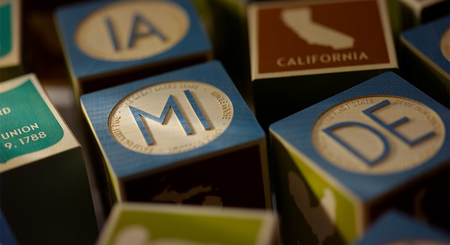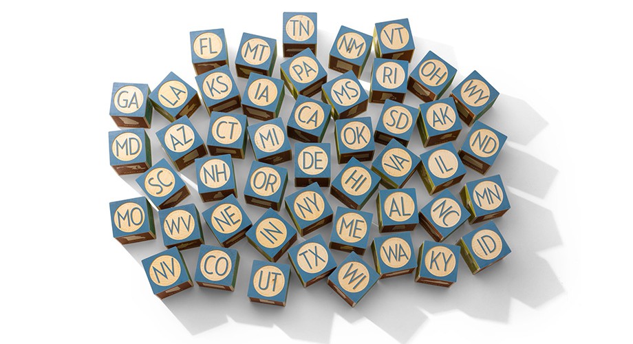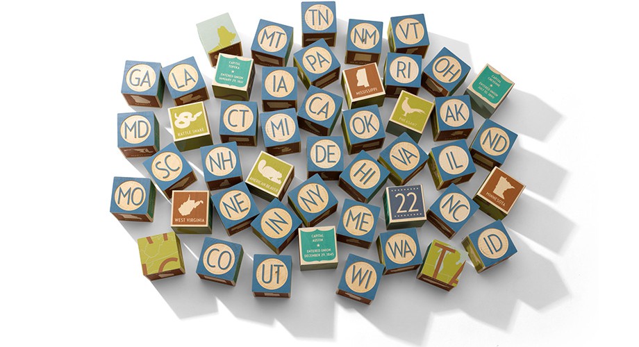 Once your young one has moved passed the alphabet, it is fun to stay engaged and move up to a more challenging set. Fifty unique State blocks: State images, names, capitals, mottos, birds, flowers, and trees. Everything a child needs to ace their first civics test. It can be fun to create family games with these as memories can get a little rusty and adults can use the challenge too. Handmade in the USA. Designed by the world renowned team at House Industries.