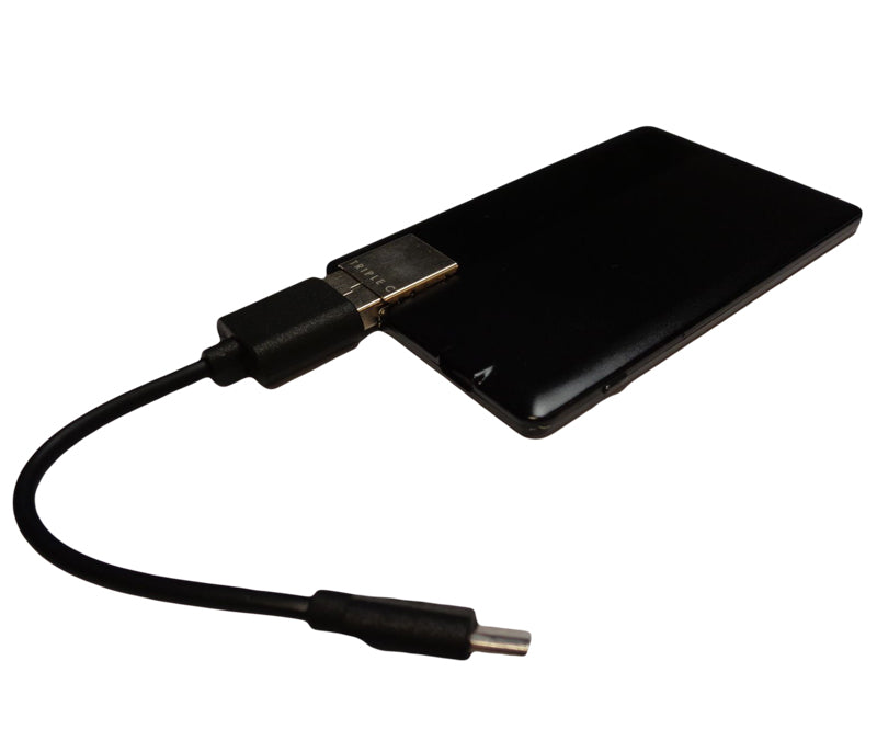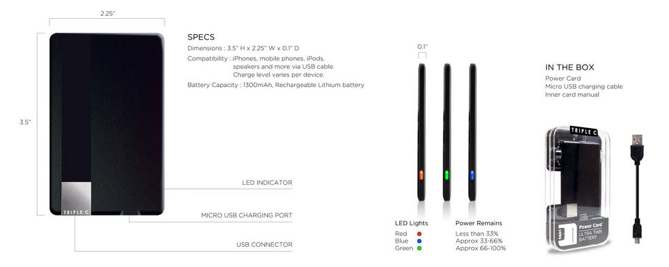 Triple C Designs power card is the lightest and thinnest (5mm) charger for your iPhones, mobile phones, iPods, speakers and fits perfectly in your wallet. The LED button indicates the power level.