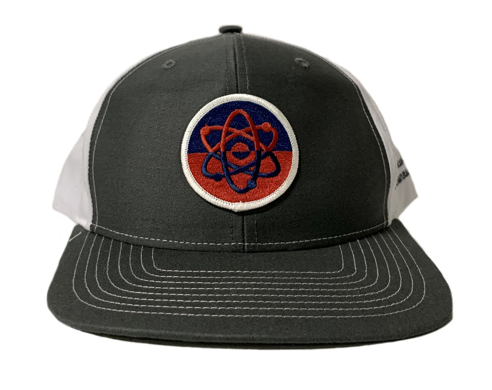 An embroidered Atom patch and the Museum logo are featured on this two-tone dark gray and white cotton blend trucker cap. Flat bill. Adjustable plastic strap. One size fits most.