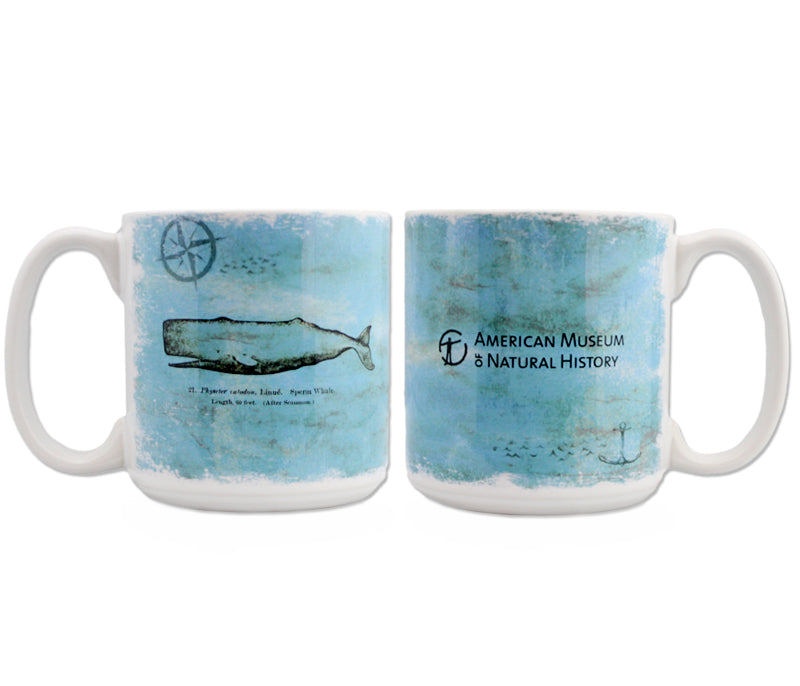 Enjoy your morning coffee or tea in this beautiful ceramic vintage whale mug, featuring a sketch of a sperm whale on one side and the American Museum of Natural History logo on the opposite side.