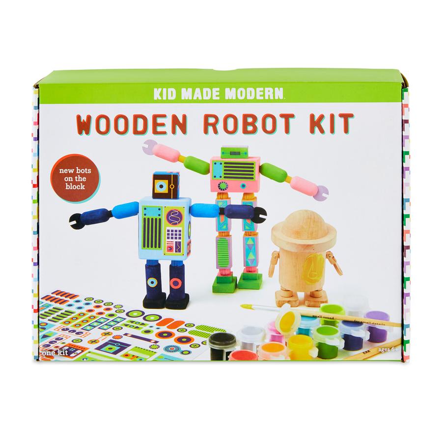 No robotics degree required to build and customize these robots. This craft kit includes everything you need to build a trio of wooden robots and crafting them is only half the fun. Once they €™re done, they make fantastic toys or decorations for the room. Makes three robots. Includes paints, paint brushes, and stickers. Ages 6 and up. Cosmic Necklace Kit, Cosmic Craft Kit, and Wooden Spaceship Kit also available.