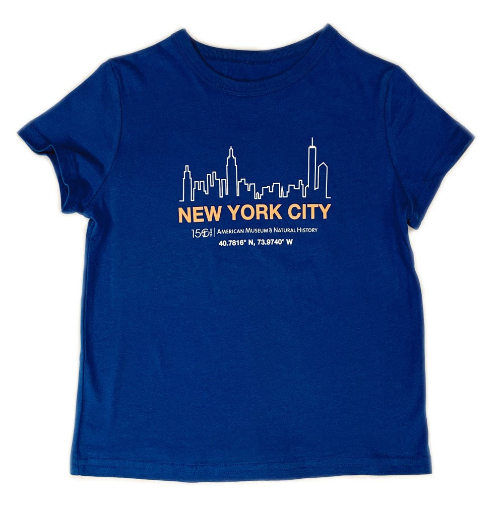 On this exact longitude and latitude featured on this child's royal blue t-shirt lies the American Museum of Natural History in NYC. This eco-friendly t-shirt that kids can wear to show their love of the Museum is made of 100% organic cotton grown using no chemicals or pesticides.